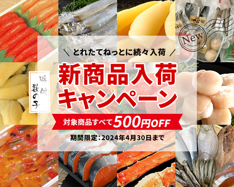 北海道産の海産物が続々入荷!4月30日まで対象商品がすべて500円OFFにて販売中!北海道の海の幸を是非、ご堪能ください。