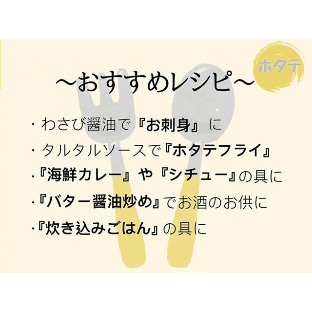 鮮度抜群のほたてを冷凍しているので刺身がおすすめですが、バター焼きなど様々な味わい方でお召し上がりいただけます。