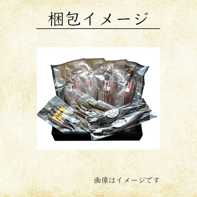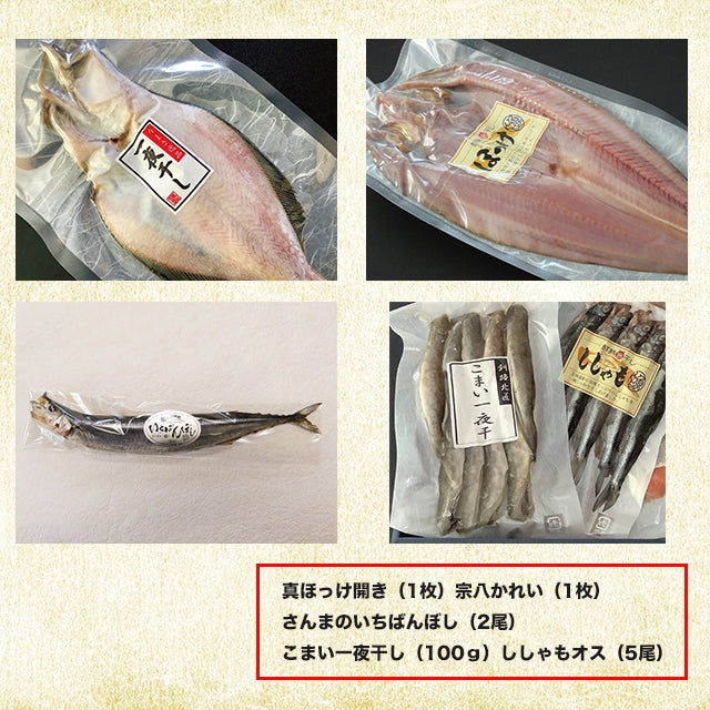 内容量 | 真ほっけ開き(2枚) さんまのいちばんぼし(2尾) 宗八かれい(2枚) ししゃもオス(5尾) こまい一夜干し(100g) |