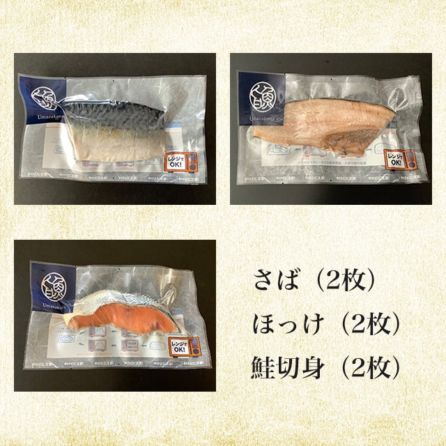 さば(2枚) ほっけ(2枚) 鮭切身(2枚) |